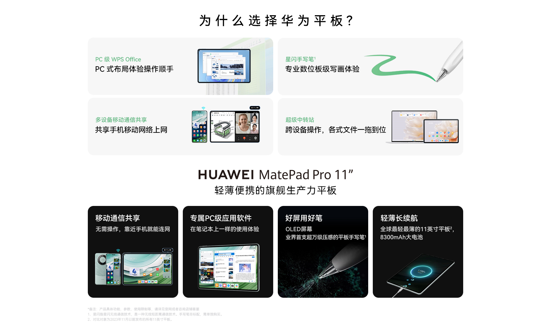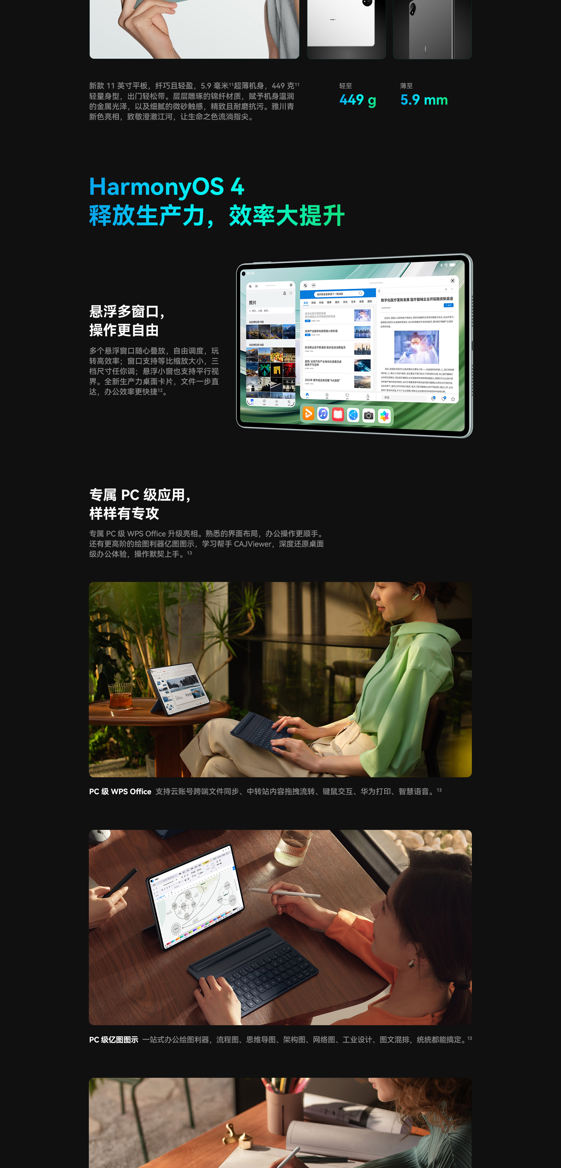 可搭配星闪手写笔 / 双向北斗卫星消息 / 移动通信共享 / 专属PC级应用软件 / 轻薄长续航 / 鸿蒙专业生产力